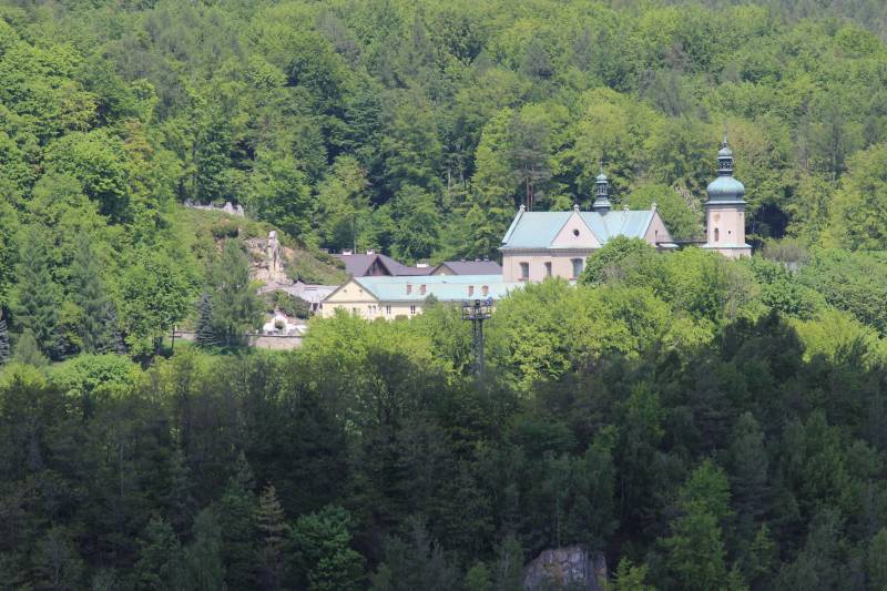 których wyrastają zabudowania klasztoru karmelitów w Czernej. W drodze